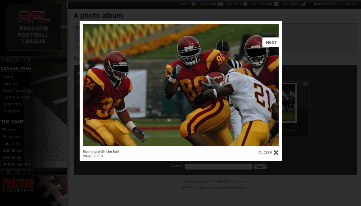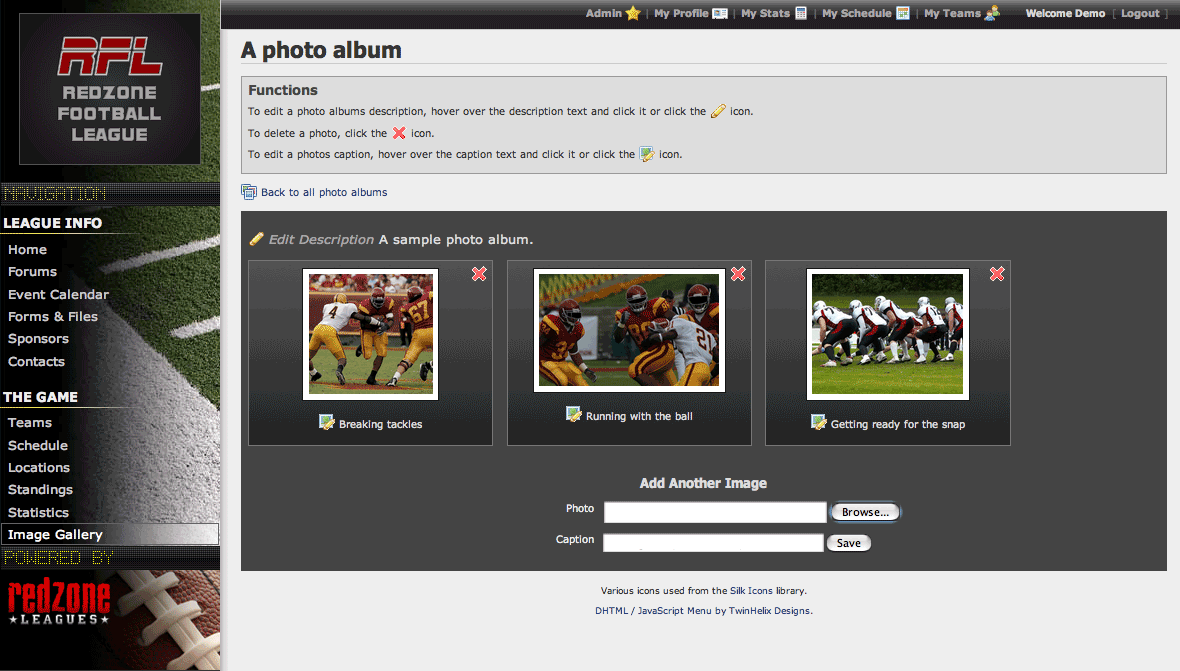 With Redzone you can upload images to display on your website and organize them into photo albums. Redzone will automatically create thumbnails for you and resize your images so they look great inside your site. You can also add captions to your images and give each of your photo albums a name and description.